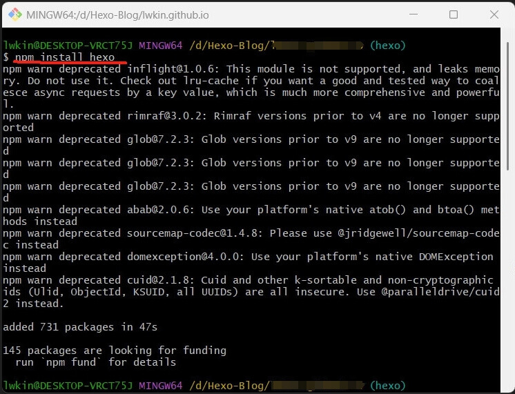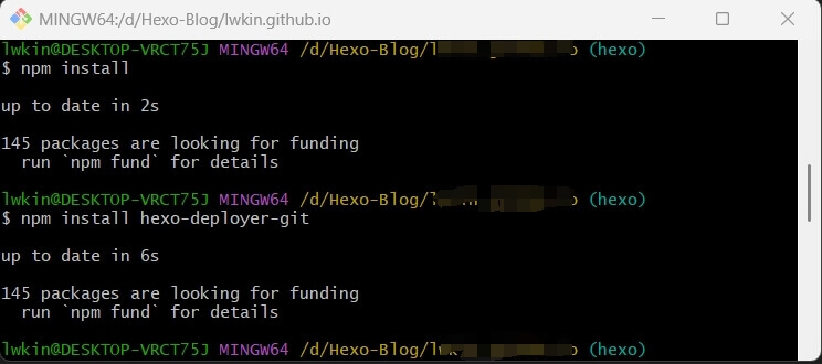 - 在clone下来的仓库文件夹中安装和配置hexo环境,依次使用以下命令: