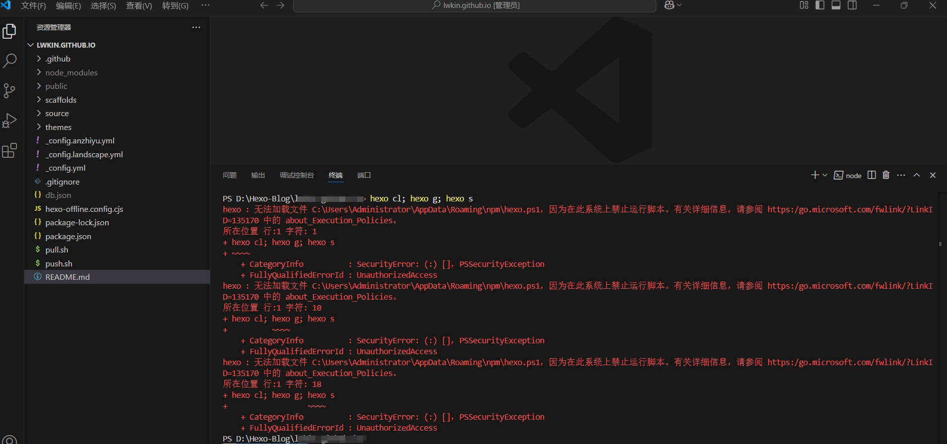 如果在Visual Studio Code中通过命令hexo cl; hexo g;hexo s在本地预览,可能会报如下错误: