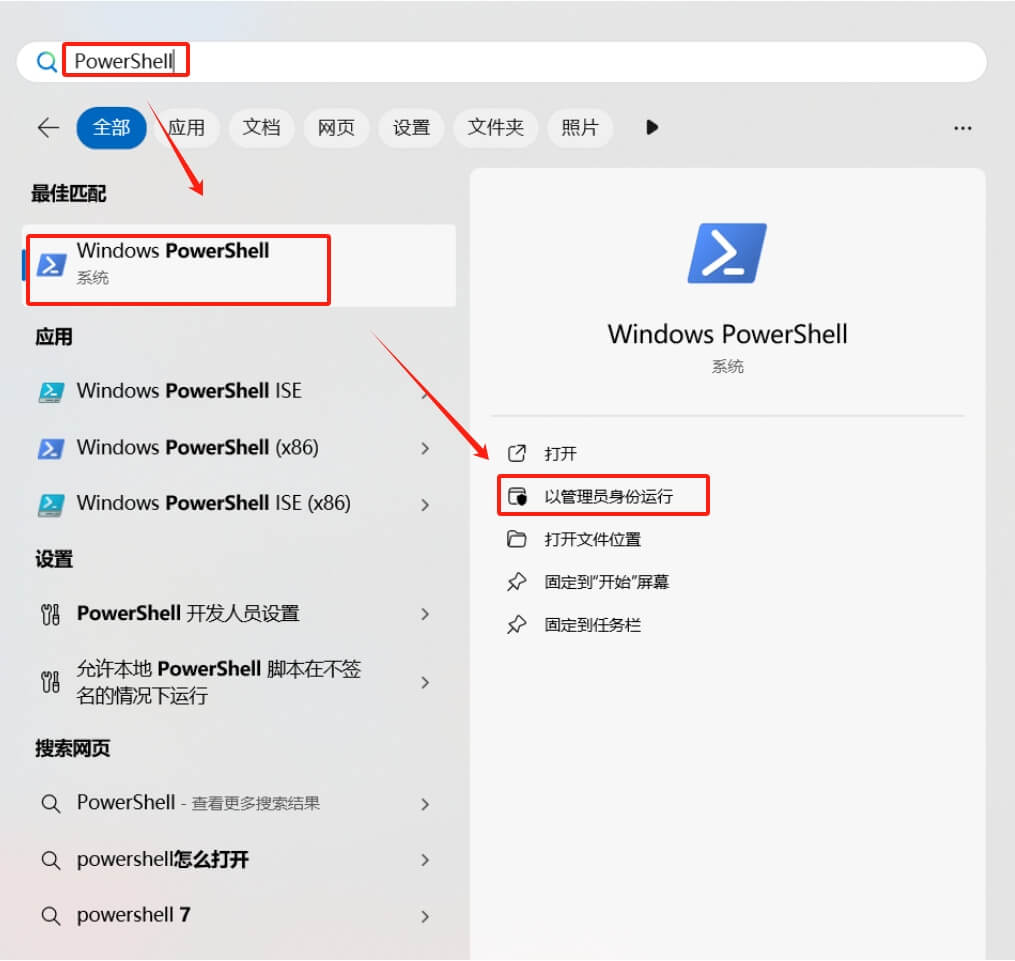 在 Windows 搜索栏中输入 “PowerShell”,然后以管理员身份运行“Windows PowerShell” 。