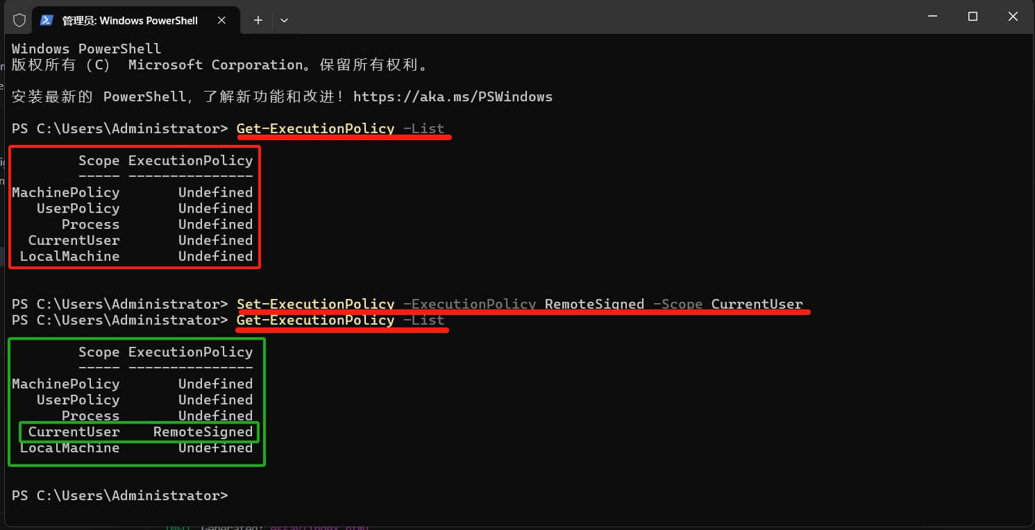 - 确认更改:再次运行以下命令以确认执行策略已更改